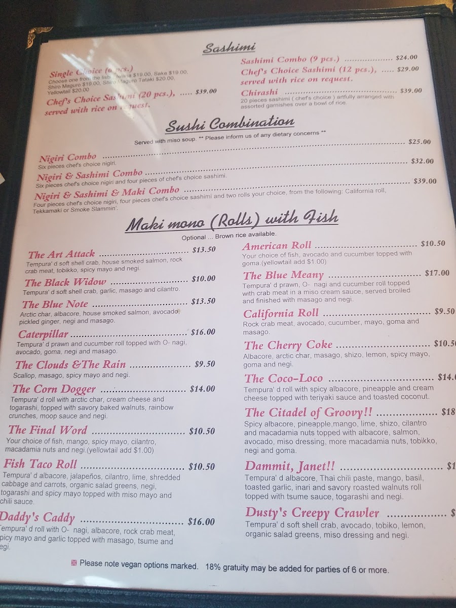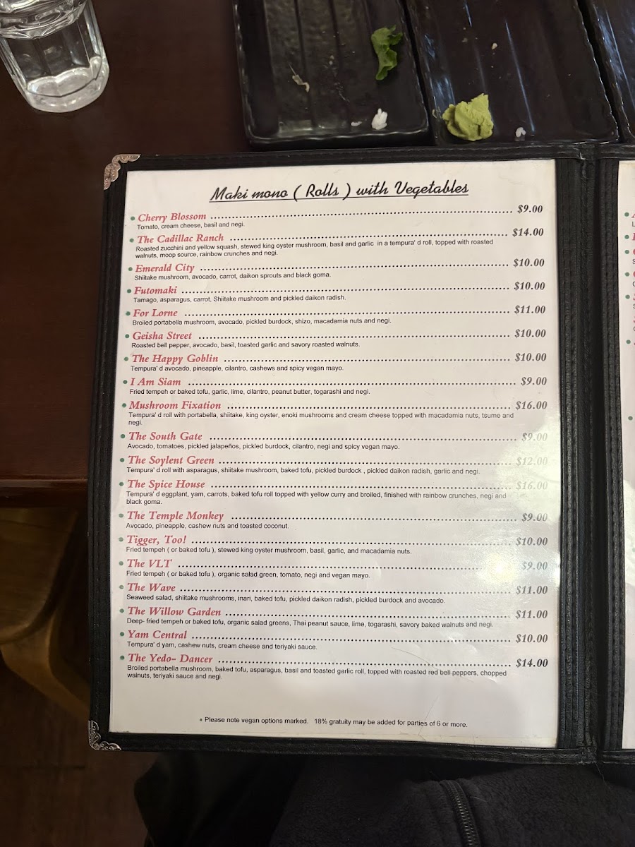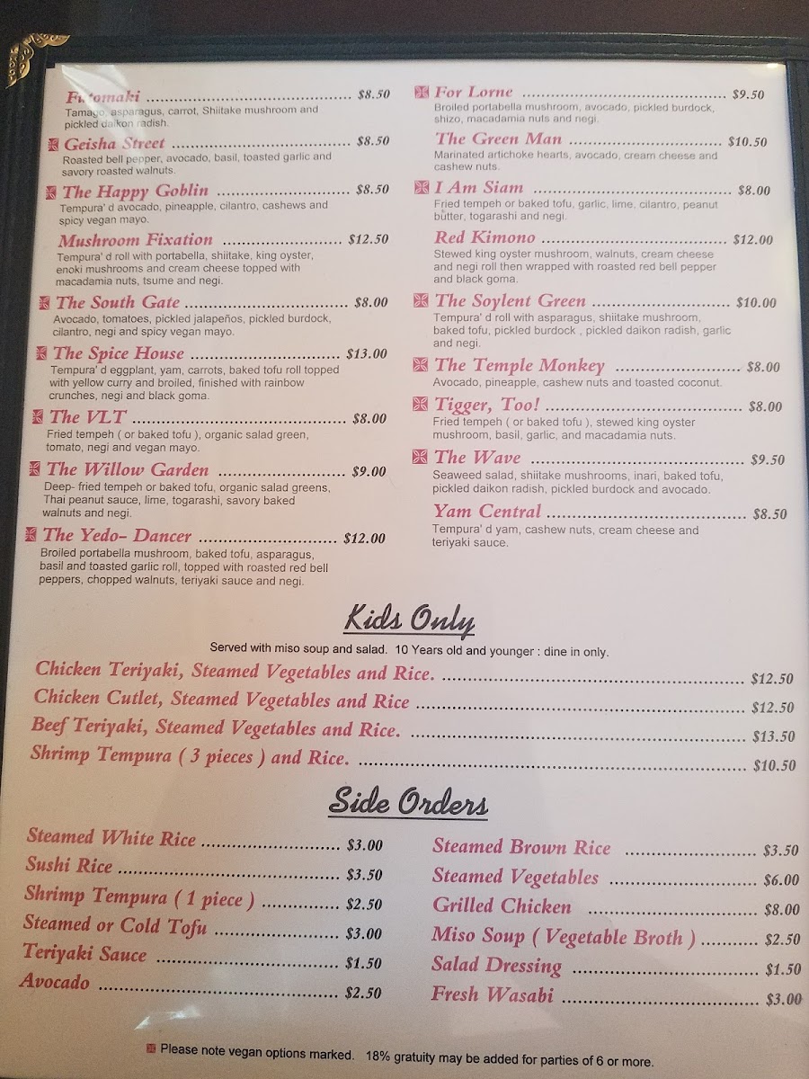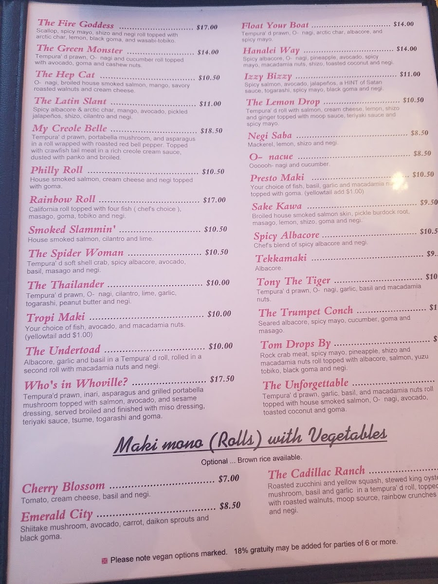 Geisha Japanese Restaurant and Tea House in Capitola offers a refined menu celebrating authentic Japanese flavors with a distinct vegan-friendly edge. Their Maki Mono rolls stand out, especially creative vegan options like the I Am Siam with fried tempeh and peanut butter, or the Soylent Green featuring tempura asparagus and shiitake mushrooms—each crafted without the usual vegan price premium. Signature specials such as the Home Ruler, layered with spicy albacore, yellowtail, jalapeño, and ponzu, provide bold, fresh profiles for sushi lovers.